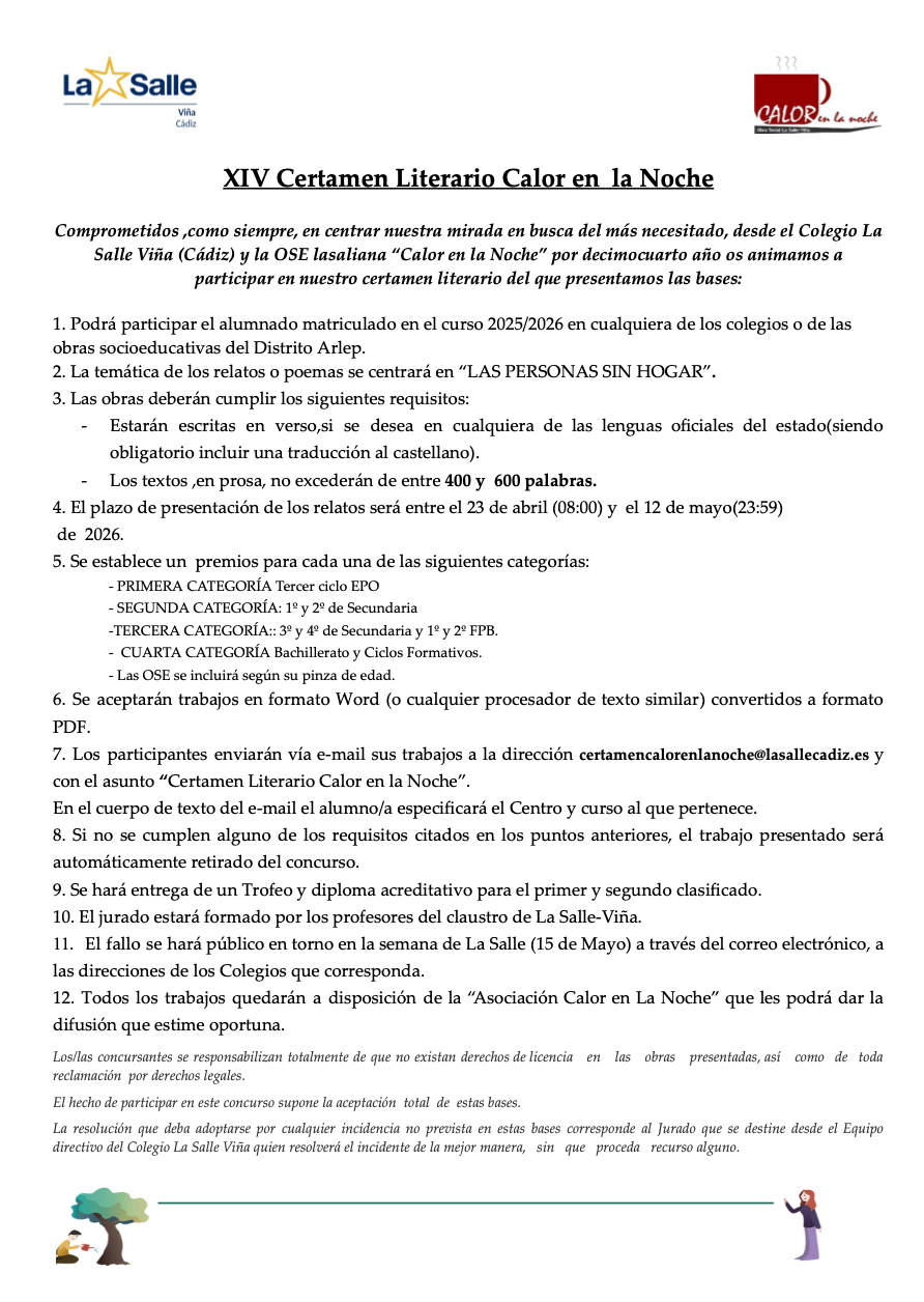 Desde el Colegio La Salle Viña de Cádiz y la Obra Socioeducativa (OSE) «Calor en la Noche», nos es grato anunciar la apertura de la decimocuarta edición de nuestro certamen literario. En un año marcado por la continuidad de nuestra misión de servicio, de compromiso en compromiso, queremos invitar a todo el alumnado del Distrito Arlep a unir su voz y su talento en favor de los más invisibles.